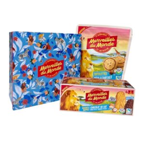 Craquez pour notre magnifique boîte métallique Merveilles du Monde, au design inédit signé Studio Polète. Elle contient 2 paquets de biscuits gourmands : nos biscuits animaux nappés et nos tartelettes à la pâte à tartiner. Une fois dégustés, gardez précieusement la boîte collector pour y ranger vos biscuits préférés ou vos tablettes et prolonger le plaisir. Un cadeau parfait pour les gourmands qui aiment croquer la vie avec style !