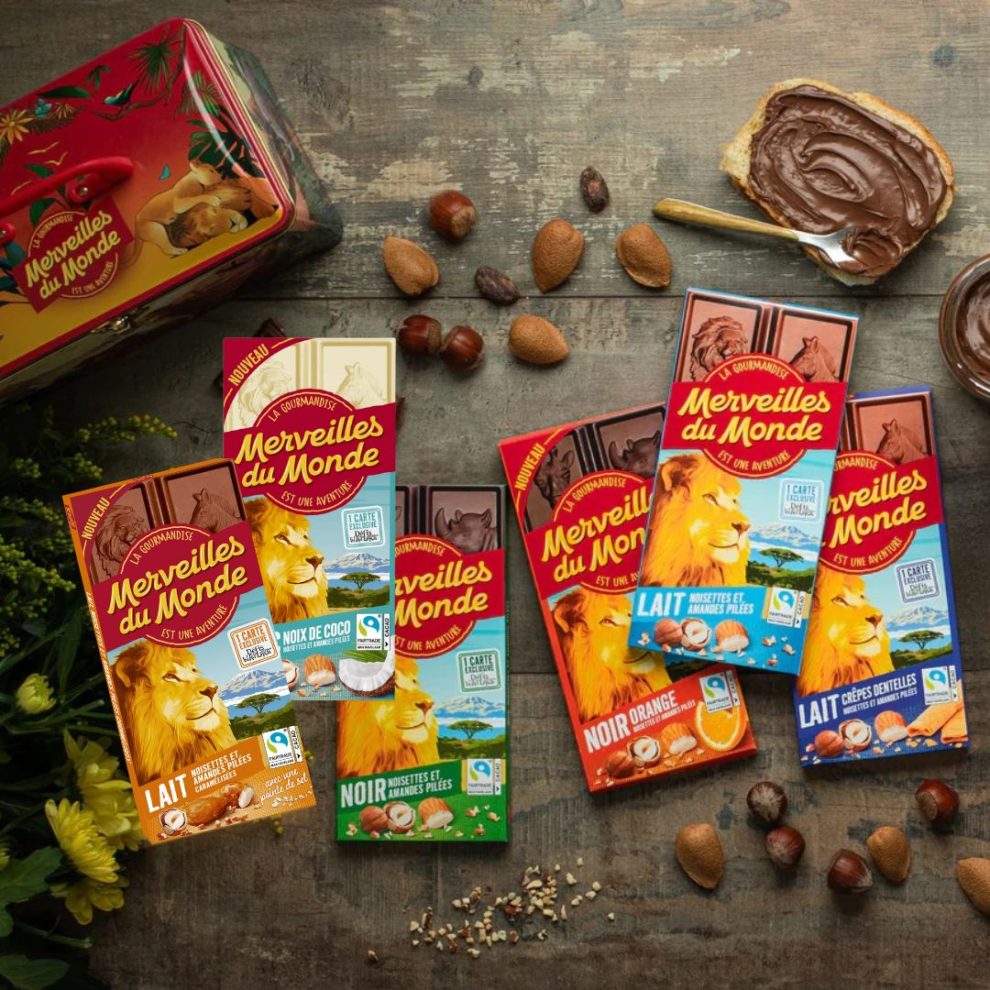 • Tablette chocolat au lait, noisettes et amandes pilées : la tablette iconique Merveilles du Monde.