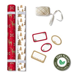 Kit zéro plastique : Un pack écologique grâce à son emballage en carton recyclable et réutilisable. Les deux rouleaux de papier cadeau ne sont pas filmés et sont imprimés sur du papier affiche 80g. Dans une optique zéro plastique, le bolduc est en papier et permet de parfaire vos emballages. A vos plus beaux nœuds.