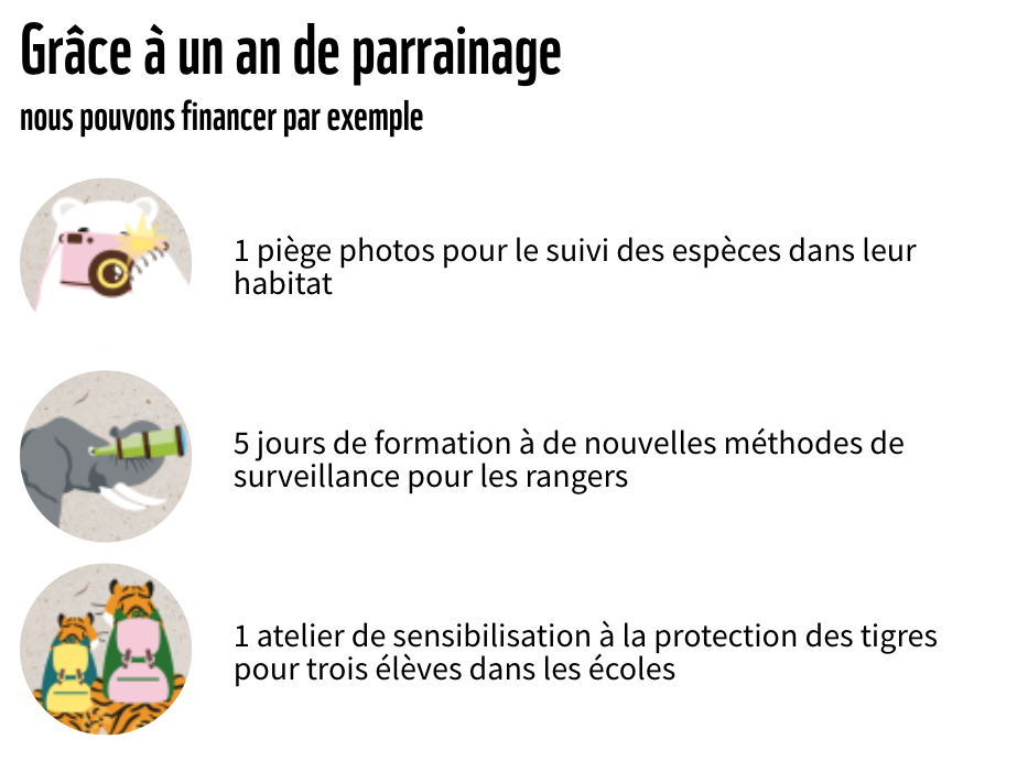 En parrainant une espèce, vous recevrez un kit exclusif comprenant : un certificat d’adoption personnalisé, une fiche de présentation de l’espèce, un sac aux couleurs du WWF, ainsi qu’une peluche. Vous recevrez également notre magazine Trace du panda, pour rester informé de nos projets et suivre de près l’impact de votre engagement.