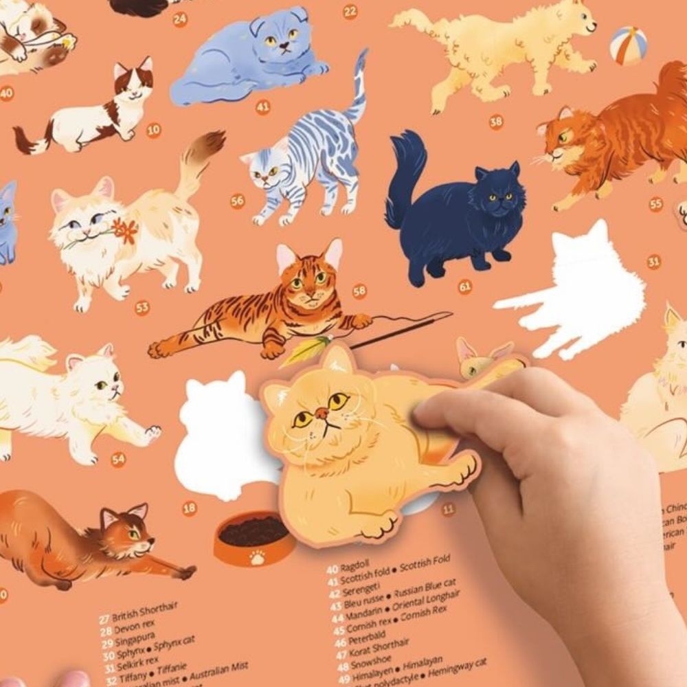 Plongez les enfants dans un univers félin plein de découvertes grâce à ce grand poster éducatif rempli de chats à reconnaître, observer et compléter. Ce jeu créatif invite les plus curieux à explorer la diversité des races de chats tout en s’amusant à placer chaque sticker au bon endroit. Une activité calme et ludique qui développe la concentration et enrichit le vocabulaire animalier.